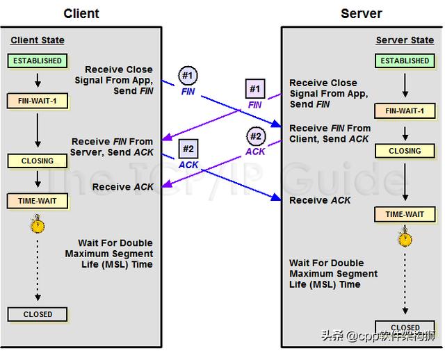 对于4次挥手,其实你仔细看是2次,因为TCP是全双工的,所以,发送方和接收方都需要Fin和Ack。只不过,有一方是被动的,所以看上去就成了所谓的4次挥手。如果两边同时断连接,那就会就进入到CLOSING状态,然后到达TIME_WAIT状态。下图是双方同时断连接的示意图(你同样可以对照着TCP状态机看):