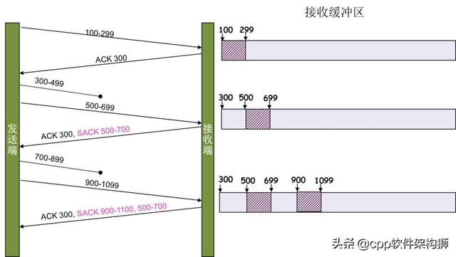 另外一种更好的方式叫:Selective Acknowledgment (SACK)(参看RFC 2018),这种方式需要在TCP头里加一个SACK的东西,ACK还是Fast Retransmit的ACK,SACK则是汇报收到的数据碎版。参看下图: