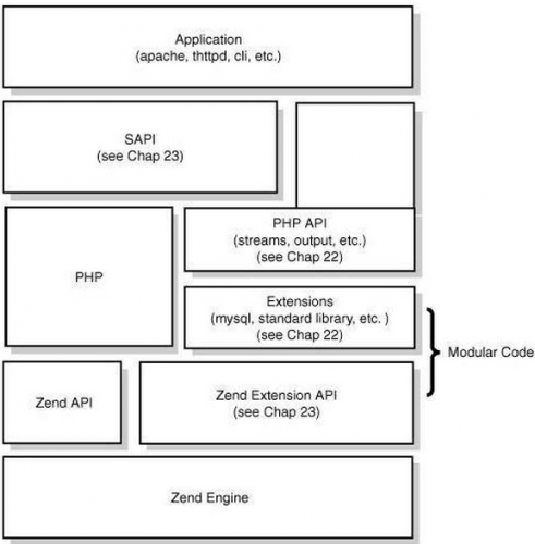 SAPI提供了一个和外部通信的接口,使得PHP可以和其他应用进行交互数据。php默认提供了很多种SAPI,常见的给apache的mod_php5,CGI,给IIS的ISAPI,还有Shell的CLI。对于一个基于apache的php应用,其运行流程可以简单归结如下: