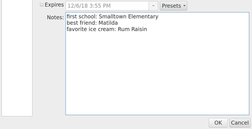 2. 使用Notes字段记录额外的安全信息。除了密码外,大多数网站还会询问几个问题,以便为帐户创建额外的身份验证因子。我使用帐户条目中的Notes部分来记录这些额外因子。