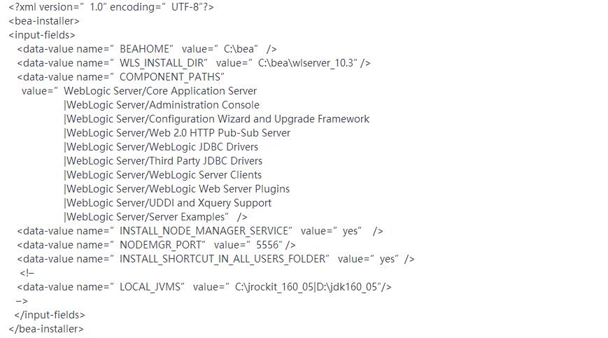 注:这个标签?<data-value name=”COMPONENT_PATHS” value=里面的内容要用一行写完,中间不可以回车,否则报错。上面是为了格式好看才对齐的。错误信息:ERROR [home] com.bea.plateng.wizard.installer.silent.tasks.SilentBEAHomeTask – The local BEA product registry is corrupted. Please select another BEA Home or contact BEA Support。