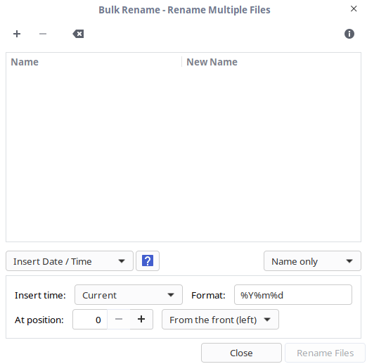单击“+”,然后选择要重命名的文件列表。 批量重命名可以重命名文件的名称、文件的后缀或者同时重命名文件的名称和后缀。 Thunar 目前支持以下批量重命名: