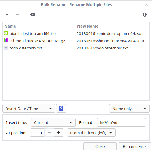Thunar 文件管理器默认具有内置批量重命名选项。 如果你正在使用 Thunar,那么重命名文件要比使用 mmv 命令容易得多。