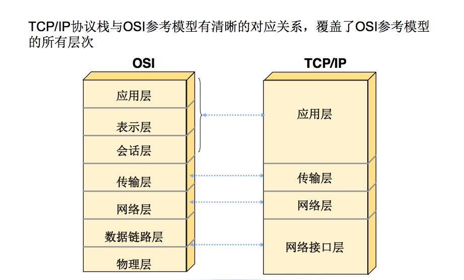 提到协议分层,我们很容易联想到ISO-OSI的七层协议经典架构,但是TCP/IP协议族的结构则稍有不同。如图所示