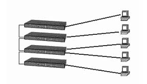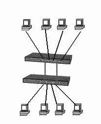 这是最常用的一种组网方式,它通过交换机上的级联口(UpLink)进行连接。需要注意的是交换机不能无限制级联,超过一定数量的交换机进行级联,最终会引起广播风暴,导致网络性能严重下降。其结构示意图如下所示。