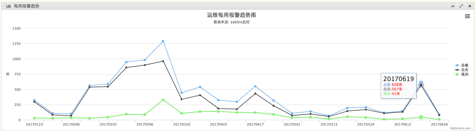 很直观的展示每周的报警数量,如果优化比较好的话,会看到整体应该是下降的趋势。