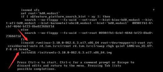 2.按↓键,找到以linux16开头的行,在最后加上 rd.break(如下图,注意前面有一个空格)