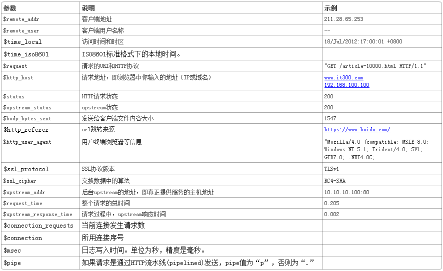 log_format name(格式名字) 格式样式(即想要得到什么样的日志内容)