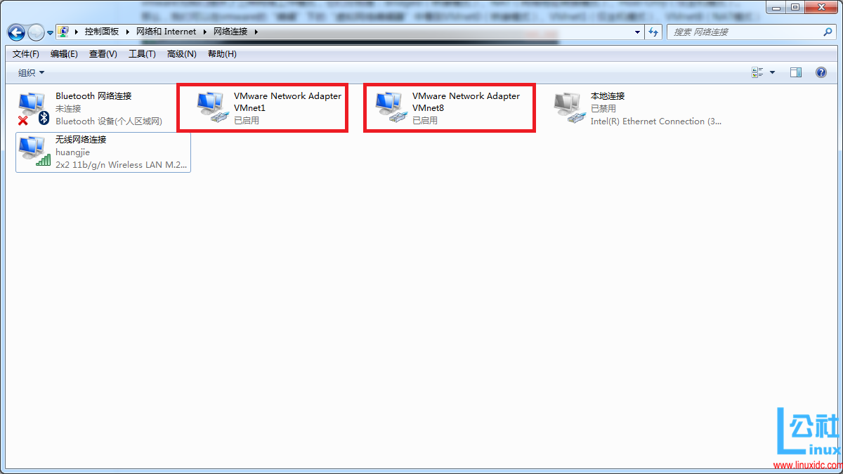 同时,在主机上对应的有VMware Network Adapter VMnet1和VMware Network Adapter VMnet8两块虚拟网卡,它们分别作用于仅主机模式与NAT模式下。在“网络连接”中我们可以看到这两块虚拟网卡,如果将这两块卸载了,可以在vmware的“编辑”下的“虚拟网络编辑器”中点击“还原默认设置”,可重新将虚拟网卡还原。
