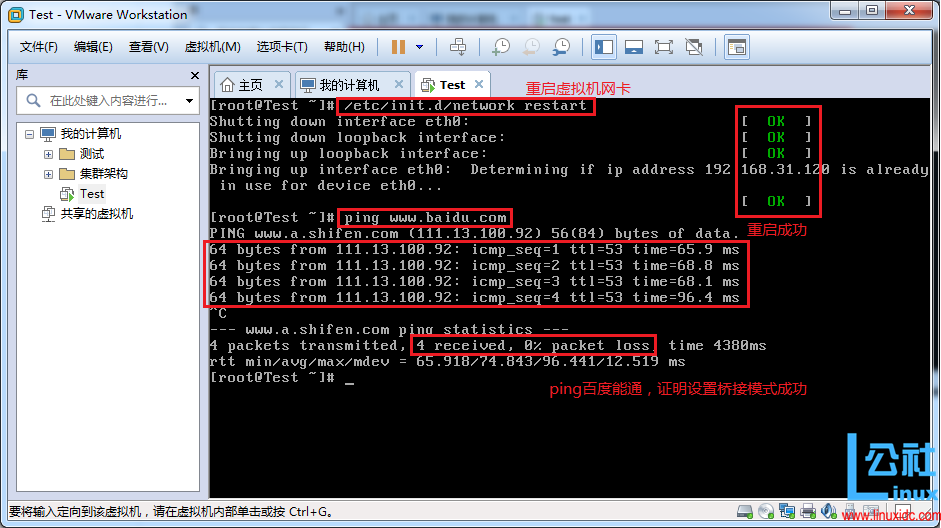 编辑完成,保存退出,然后重启虚拟机网卡,使用ping命令ping外网ip,测试能否联网。