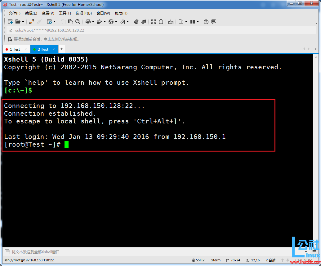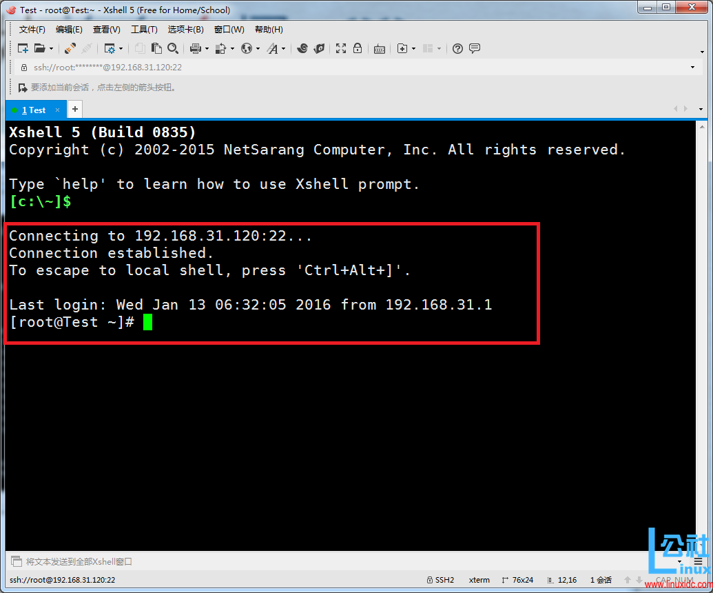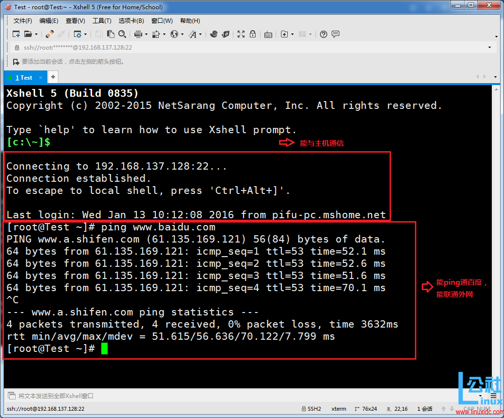 保存退出,然后重启网卡,利用远程工具测试能否与主机通信。