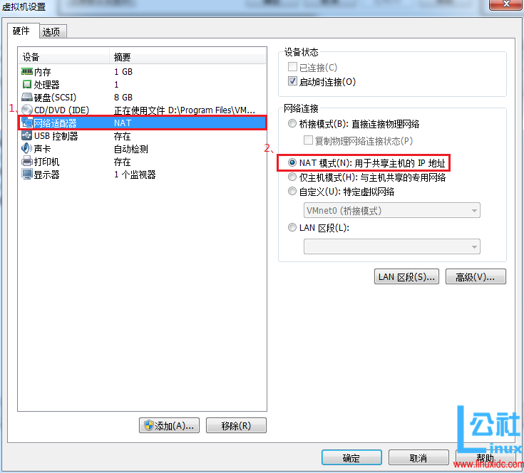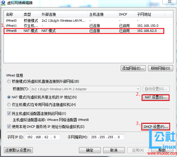 那么,这就是NAT模式,利用虚拟的NAT设备以及虚拟DHCP服务器来使虚拟机连接外网,而VMware Network Adapter VMnet8虚拟网卡是用来与虚拟机通信的。