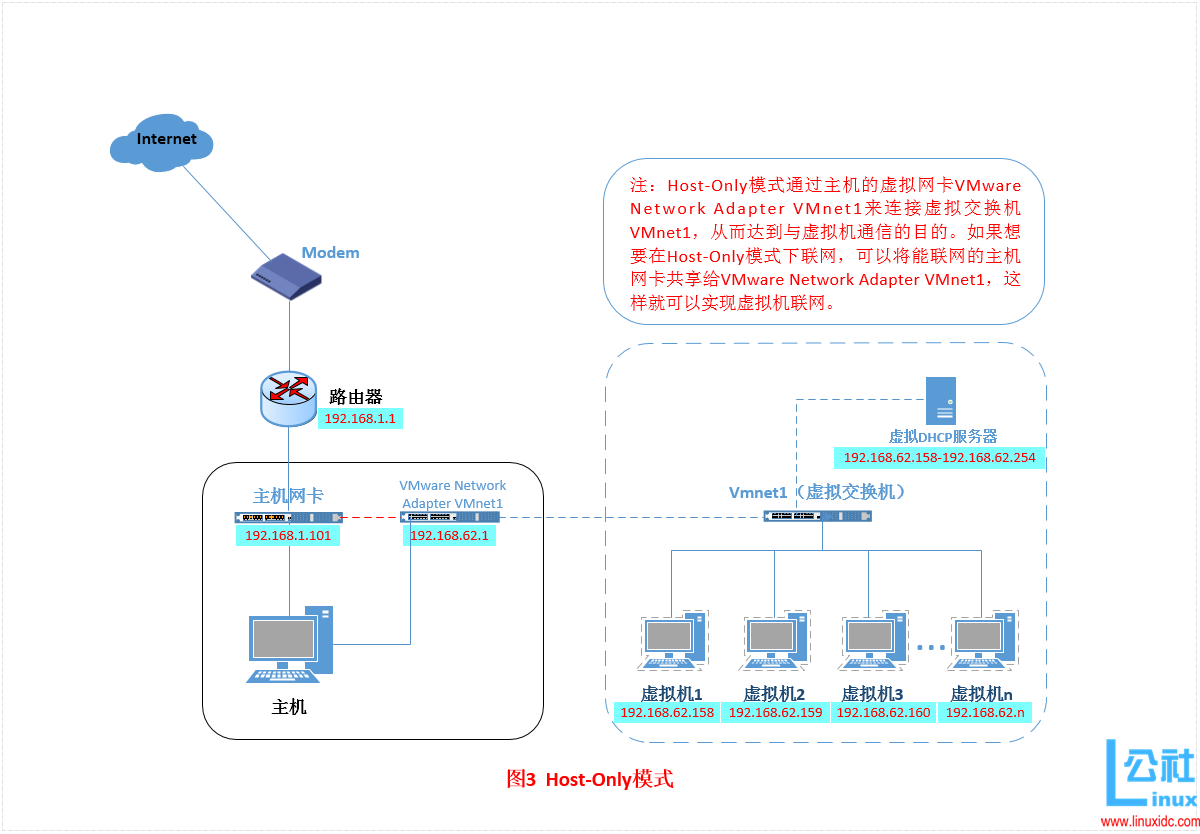 Host-Only模式其实就是NAT模式去除了虚拟NAT设备,然后使用VMware Network Adapter VMnet1虚拟网卡连接VMnet1虚拟交换机来与虚拟机通信的,Host-Only模式将虚拟机与外网隔开,使得虚拟机成为一个**的系统,只与主机相互通讯。其网络结构如下图所示: