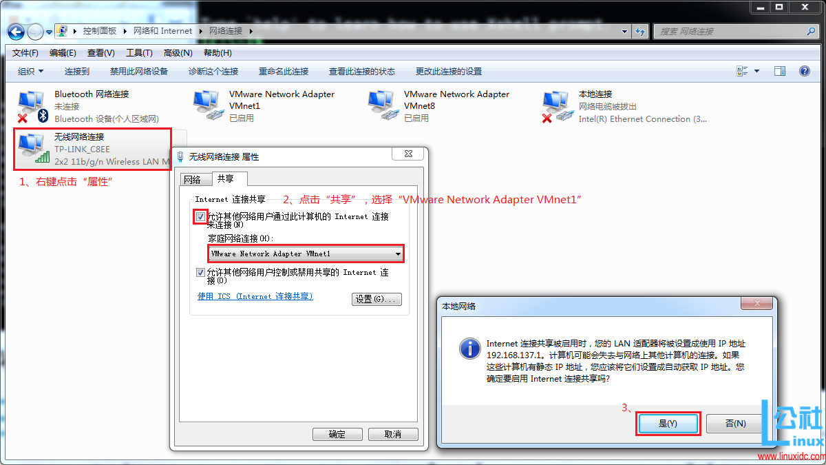 通过上图,我们可以发现,如果要使得虚拟机能联网,我们可以将主机网卡共享给VMware Network Adapter VMnet1网卡,从而达到虚拟机联网的目的。接下来,我们就来测试一下。