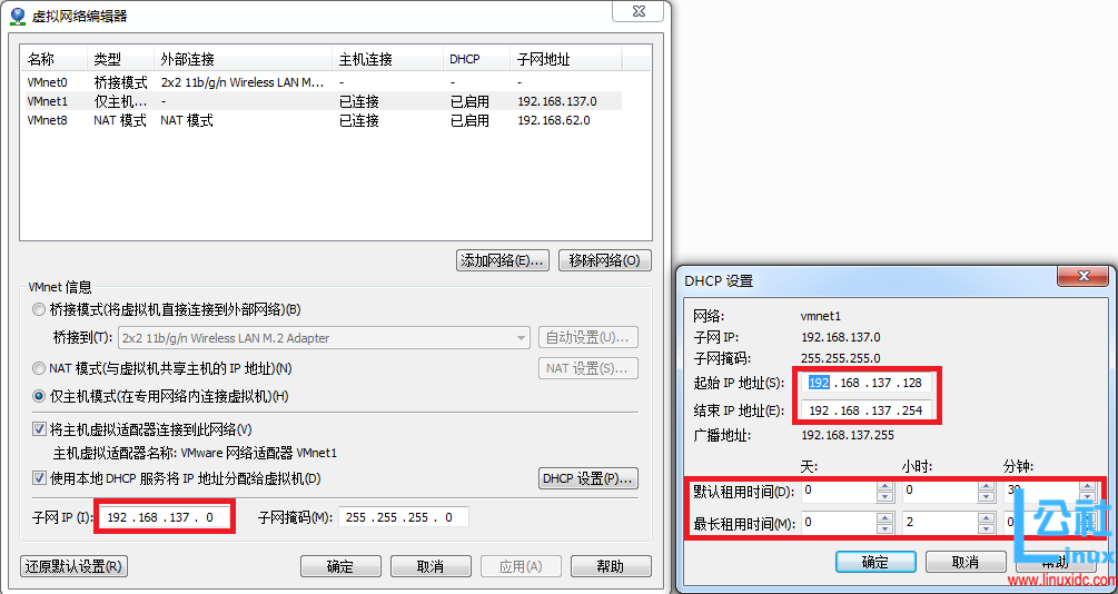 我们可以看到上图有一个提示,强制将VMware Network Adapter VMnet1的ip设置成192.168.137.1,那么接下来,我们就要将虚拟机的DHCP的子网和起始地址进行修改,点击“虚拟网络编辑器”