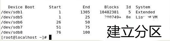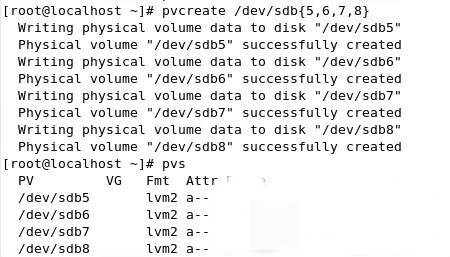 1.首先将硬盘sdb分4个区每个区大小200M,分别是sdb{5,6,7,8}。后将四个分区建立pv。
