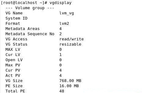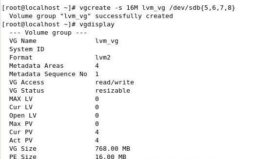建立命令如下vgcreate -s 16M lvm_vg /dev/sdb{5,6,7,8}。