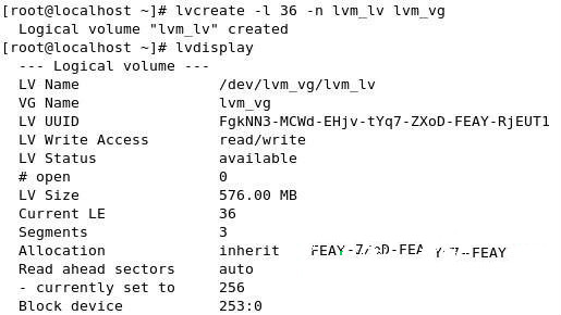 3.接下来我们利用PE块的数量来创建lv由于每个pv能划分出的PE是12个因此要创建一个600M的需要36个PE。
