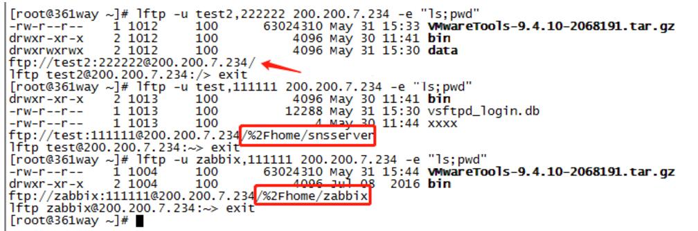 默认使用系统帐号时,ftp登陆时看到的是全路径,如zabbix帐号通过ftp登陆后pwd查看到家目录是/home/zabbix。这就是绝对路径‘;当使用虚拟帐号时,默认指定local_root,比如也是/home/zabbix,虚拟帐号名为ftptest,当使用这个帐号登陆后,pwd查看到为/ (实际是/home/zabbix),这就是相对路径。