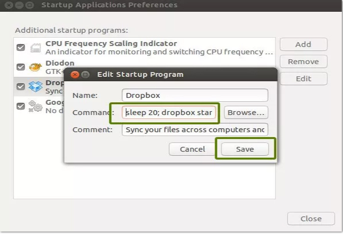 所以,命令?dropbox start -i?变为?sleep 20; drobox start -i?。这意味着现在 Dropbox 将延迟 20 秒启动。你可以通过相似的方法来改变另一个开机启动应用的启动时间。