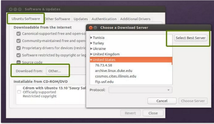 在 “Software & Updates->Ubuntu Software tab->Download From” 里选择 “Other” 紧接着点击 “Select Best Server”: