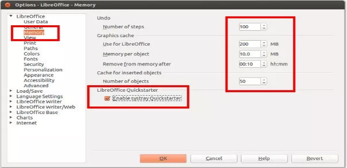 如果你是频繁使用 office 产品的用户,那么你会想要稍微调整默认的 LibreOffice 使它更快。这里你将调整内存选项。打开 Open LibreOffice,进入 “Tools->Options”。在那里,从左边的侧栏选择“Memory”并启用 “Systray Quickstarter” 以及增加内存分配。
