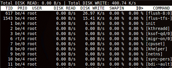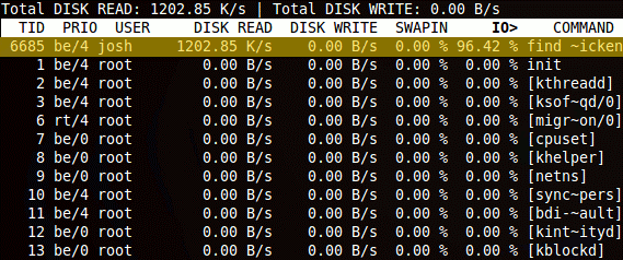 然而,如果你运行find之类的磁盘密集型实用程序,可以看到iotop清楚列出的名称和吞吐量。