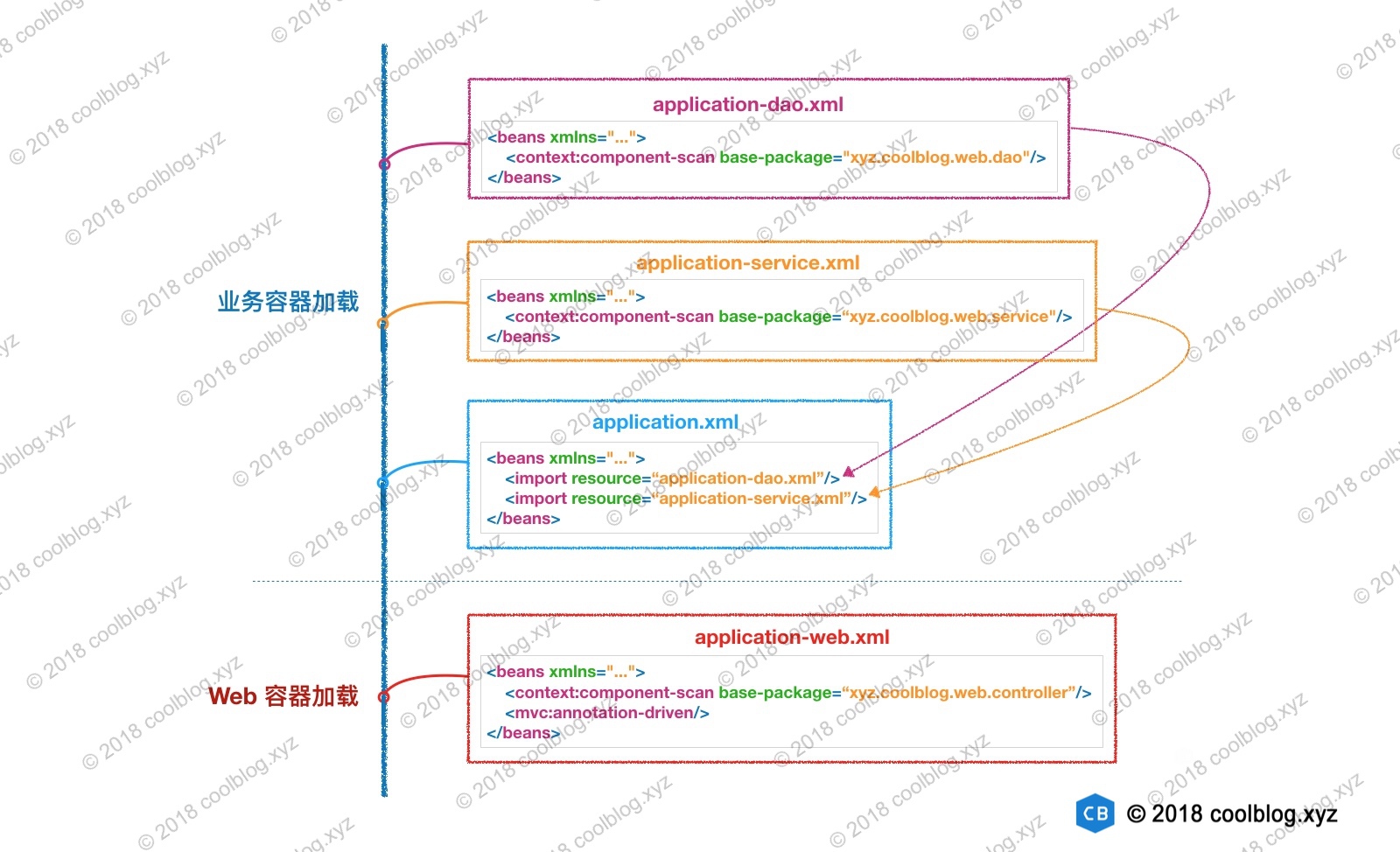 如上,我们将 dao 层的类配置在 application-dao.xml 文件中,将 service 层的类配置在 application-service.xml 文件中。然后我们将这两个配置文件通过 标签导入到 application.xml 文件中。此时,我们可以让业务容器去加载 application.xml 配置文件即可。另一方面,我们将 Web 相关的配置放在 application-web.xml 文件中,并将该文件交给 Web 容器去加载。