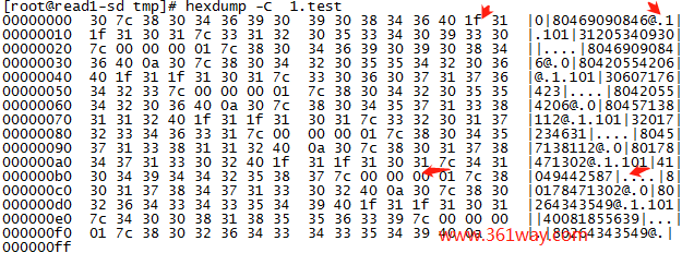 [root@read1-sd tmp]# less 1.test 0|804690908461101|31205340930||80469090846@ 0|804205542061101|30607176423||80420554206@ 0|804571381121101|32017234631||80457138112@ 0|801784713021101|41049442587||80178471302@ 0|802643435491101|40081855639||80264343549@