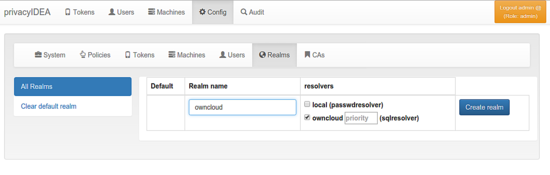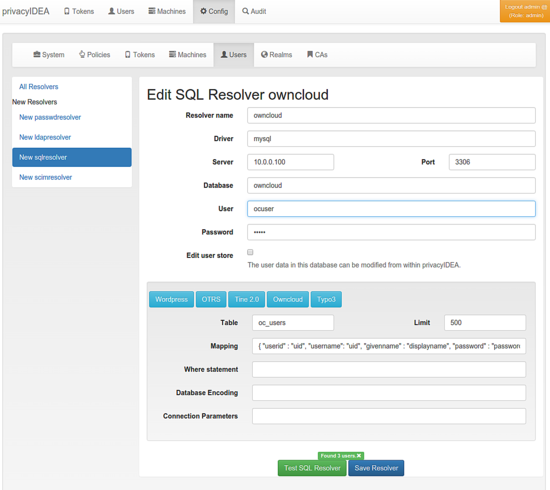 现在我们将privacyIDEA连接到ownCloud,以便privacyIDEA知道用户。 我们在Config→Users创建一个新的用户解析器 。