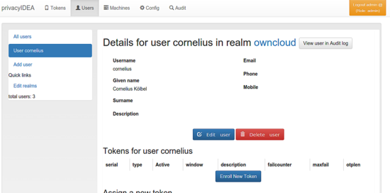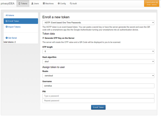 privacyIDEA有一个条件。 自己的Cloud用户必须以privacyIDEA或其他方式知道,您在privacyIDEA中分配令牌的用户也必须在ownCloud中可用。