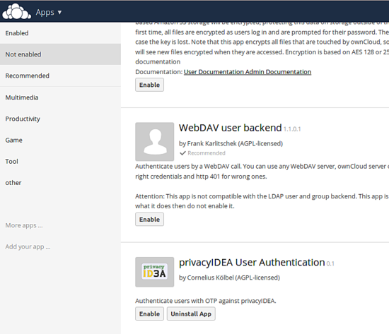 您可以在这里下载App。 您需要将目录user_privacyidea 复制到您自己的Cloud目录apps / 。 假设你把ownCloud安装到/ var / www / owncloud ,这样你就可以得到一个结构了