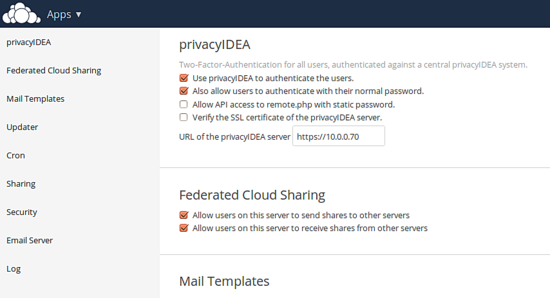 请注意:您不需要在同一台服务器上运行privacyIDEA和ownCloud。 在一个服务器上安装privacyIDEA作为身份验证系统,并根据此privacyIDEA配置其他应用程序(如ownCloud),您将释放此类设置的全部功能。 这还包括您不需要管理ownCloud的身份验证设备,您的第二个应用程序的身份验证设备和第三个应用程序的身份验证设备等优点。 你会看到,如果你有几个应用程序和两个以上的用户,这个解决方案证明了它的优势。 但当然也可以在较小的情况下工作。