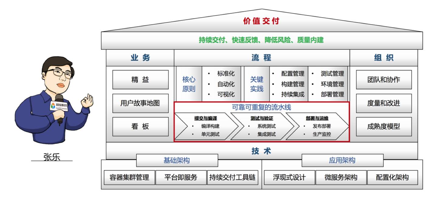 高效运维社区 DevOps 专家,前百度工程效率专家张乐同学结合自己多年的实践经验和精益屋整理出持续交付屋,其中可靠可重复的流水线就是核心内容。从提交与编译,测试与验证到部署与运维,打通软件交付的完整路径,实现真正的端到端部署流水线。