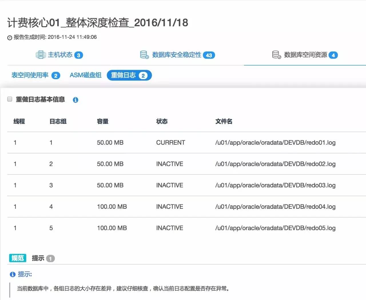 如果在日志设置上存在问题,Bethune会给出分析提示,如以下数据库的日志组大小不一致,三组日志大小是50M,另外两组日志大小是100M,这是不规范的配置,可能来自于某次临时的日志组增加,事实上需要DBA进行审视和整改: