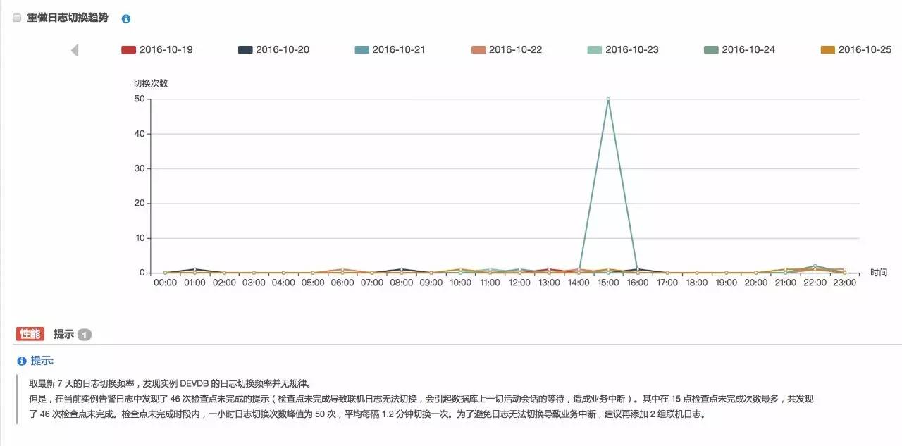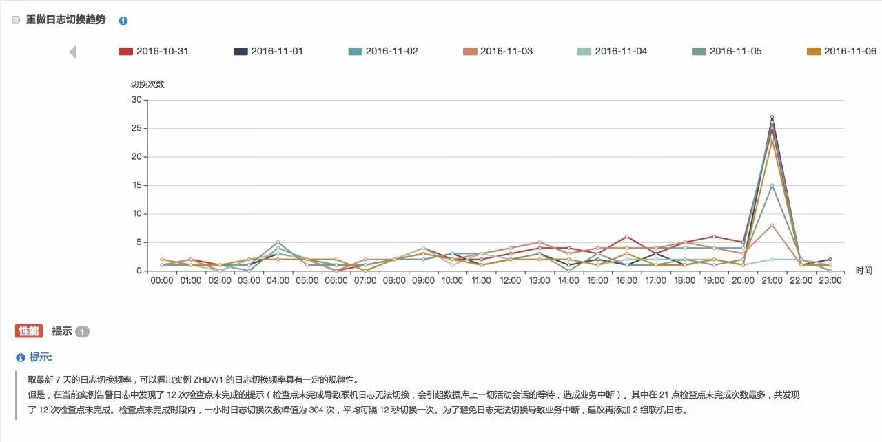 当然,如果伴随着日志切换,数据库告警日志中出现了『检查点未完成』等待,在分析提示中会以性能标签提示出来,在这种情况下,我们通常需要进行日志配置的调整以消除这类问题: