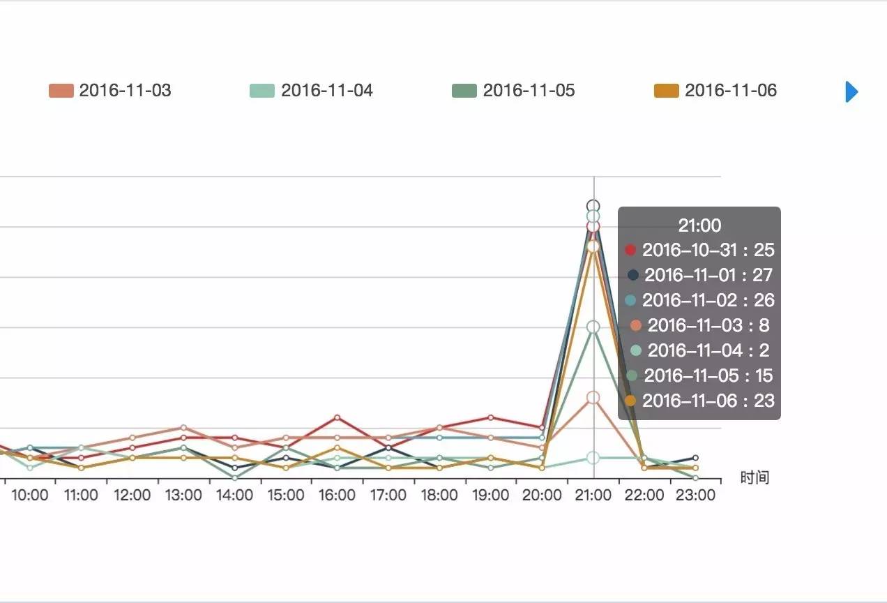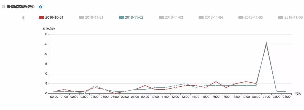 通过点选具体的日期,我们可以在趋势图保留两个日期,分析其业务变化在日志生成上的改变,如图的两个日期,日志切换的波动非常吻合,这说明这个业务系统的运行是非常规律的: