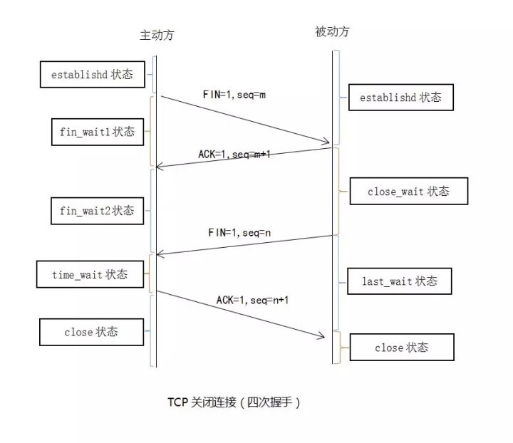 由于TCP连接时全双工的,因此,每个方向都必须要单独进行关闭,这一原则是当一方完成数据发送任务后,发送一个FIN来终止这一方向的连接,收到一个FIN只是意味着这一方向上没有数据流动了,即不会再收到数据了,但是在这个TCP连接上仍然能够发送数据,直到这一方向也发送了FIN。首先进行关闭的一方将执行主动关闭,而另一方则执行被动关闭,上图描述的即是如此。