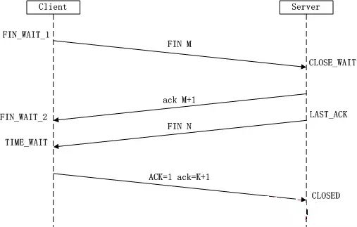 (3)第三次挥手:Server发送一个FIN,用来关闭Server到Client的数据传送,Server进入LAST_ACK状态。