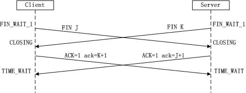 上面是一方主动关闭,另一方被动关闭的情况,实际中还会出现同时发起主动关闭的情况,具体流程如下图: