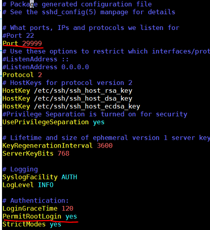 2.配置sshd_config将默认端口22设置为29999,如果想远程root账户,则设置PermitRootLogin yes,即可远程登录root账户