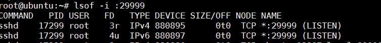 4.查看端口使用情况,如果有其他应用占用29999端口,则关闭这个服务或修改提供该服务的端口号,这里看到sshd已经开启端口为29999的远程访问服务了