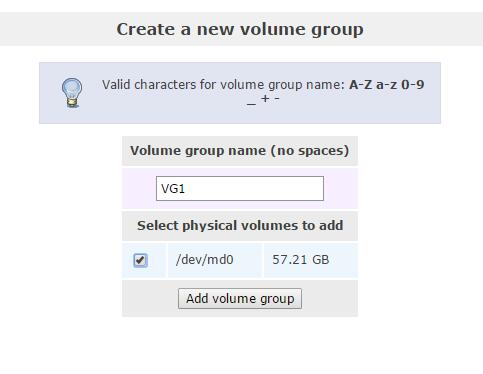 给卷组起一个名字叫“VG1”,选择物理卷“/dev/md0”