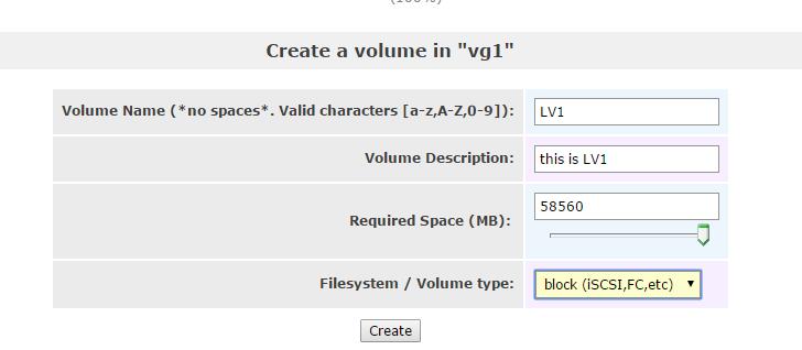 创建卷,卷的名字叫“LV1”,卷描述“this is LV1”,容量调整为最大,FileSystem / Volume type: 选择 block(iSCSI,FC,etc)