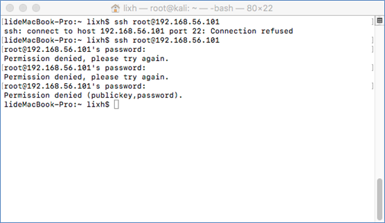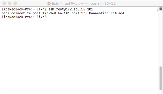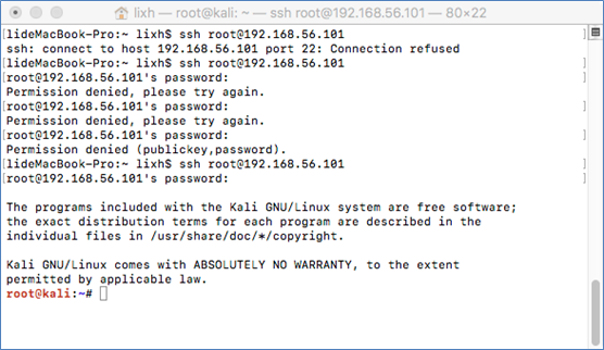 今天想用一下Kali做点坏事,没想到的是安装完了,SSH不上去,真是不爽,先来张图,看看是发生了什么,也方便有同样问题的童鞋们知道怎么解决。