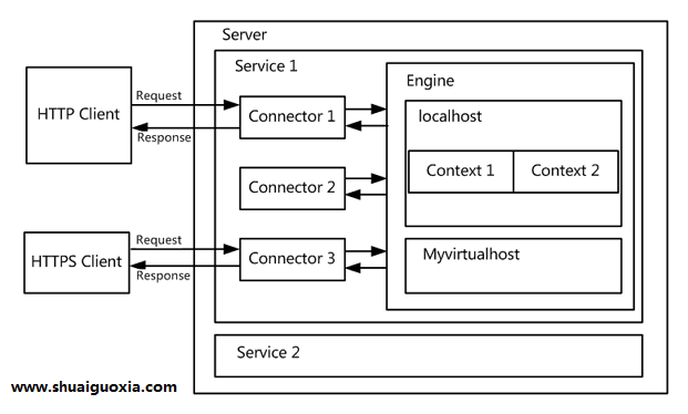 server:相当于一个tomcat实例。接收并解析请求信息;完成相关动作后把响应结果返回给计算机。 service:每个server包含多个service,相互独立,仅共享JVM以及类库。用于把连接器(connector)与引擎(engine)关连起来,且一个service只能有一个engine,但是可以有多个connector。因为engine无法直接接受连接器发来的数据。 connector:负责开启socket并监听客户端请求、返回响应数据。多个connector监听多个端口 engine:负责具体的处理请求,connector仅仅负责监听,收到数据后交给engine运行。 host:在ngine中可以包含多个host,每个host定义了虚拟主机 context:每个context可以部署一个web应用。一个host可以存在多个context。如果部署多个应用需要分别对每个应用装载所依赖的库,这个步骤可以自动可以手动。