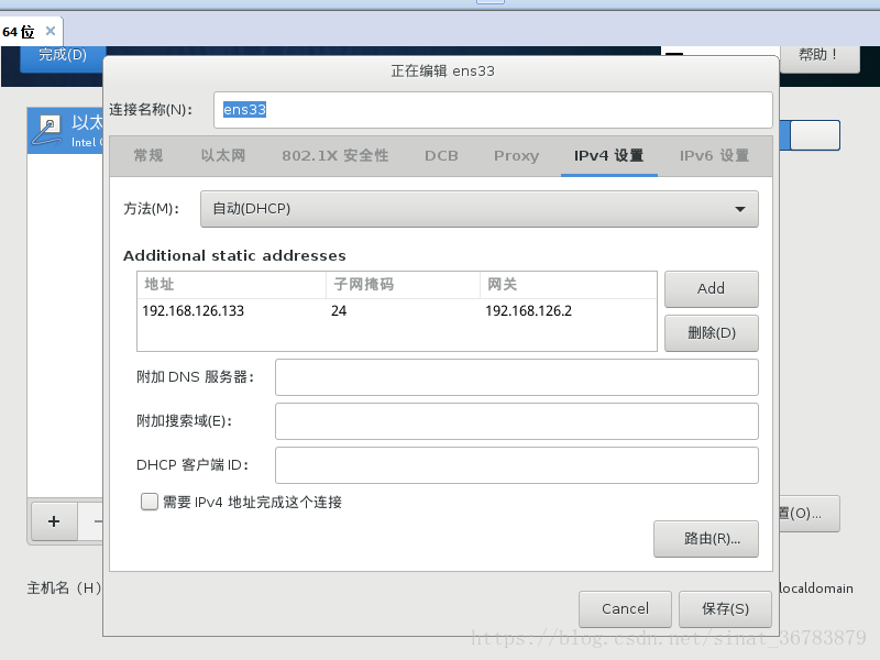 后来在安装过程中设置网络的时候 改成静态ip就好了,如图,(前提是按照上面的连接一步步到此的时候)当你打开以太网的时候,下面会显示ip地址,拍照记下来,后面会用