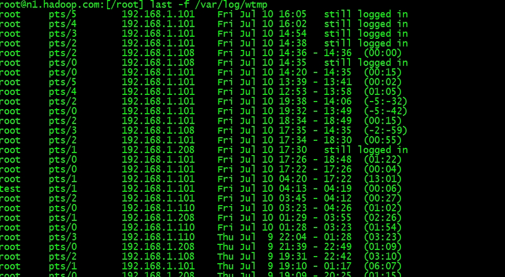 last命令就通过访问这个文件获得这些信息,并以反序从后向前显示用户的登录记录,last也能根据用户、终端tty或时间显示相应的记录。
