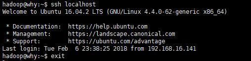 $ sudo apt-get install openssh-server #ubuntu默认安装了SSH client,此处安装SSH server $ ssh-keygen -t rsa $ sudo localhost #登陆SSH,第一次登陆输入yes $ exit #退出登录的ssh localhost $ cat ./id_rsa.pub >> ./authorized_keys #加入授权 $ ssh localhost #无需密码登陆,可看到如下界面