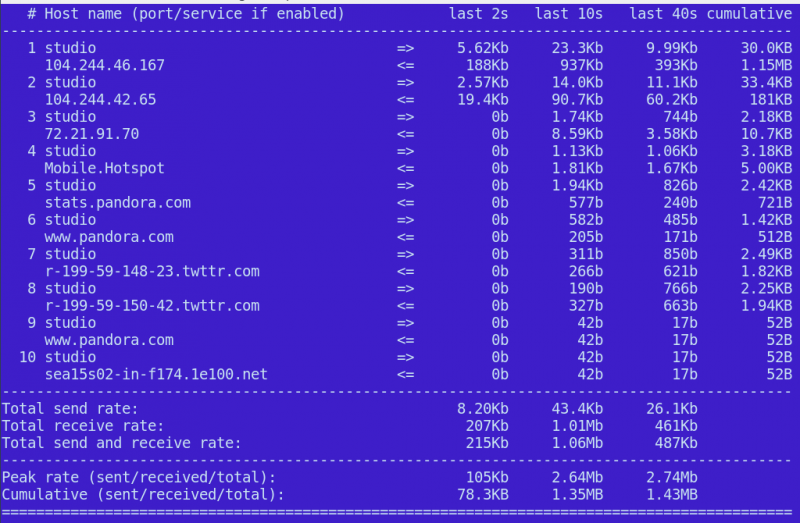 当你切换显示设置的时候,iftop 并不会中断监测流量。当然你也可以单独监测一台主机。而这需要该主机的 IP 地址和子网掩码。现在,我很好奇 Pandora(LCTT 译注:一家美国的电台公司)能给我贫瘠的带宽带来多大的负载。因此我首先使用 dig 命令找到他们的 IP 地址: